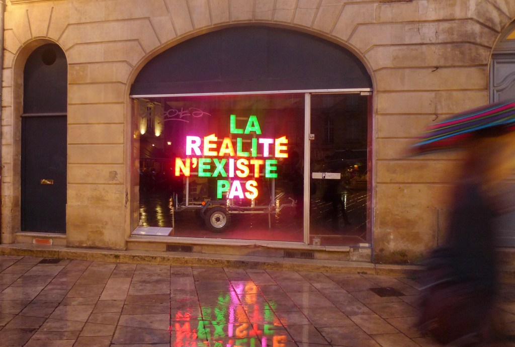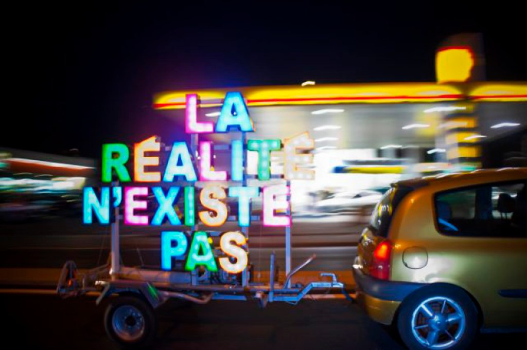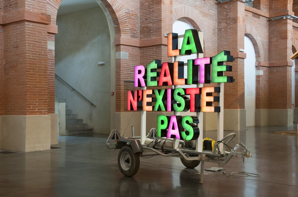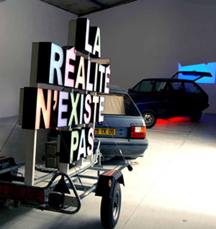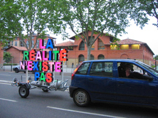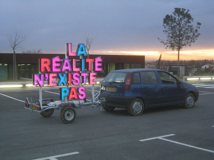 Leur œuvre phare «La réalité n’existe pas» est aujourd’hui dans les collections du musée des Abattoirs. Posé sur une remorque, à mi-chemin entre l’utilitaire et la publicité, le slogan «La réalité n’existe pas» rappelle les mots d’ordre situationnistes des années 1960, la paranoïa des séries télévisées et l’essor des théories du complot. Décalée, assumant son aspect bricolé et festif, l’œuvre se pose (prend son sens) dans des espaces publiques, la rue ou les lieux d’art. Peu importe sa place, elle est toujours étrange, distante, malgré les jeux qui tournent autour de ses sorties. Elle redit en scintillant à l’heure de la «réalité augmentée» que «la réalité n’existe pas».»